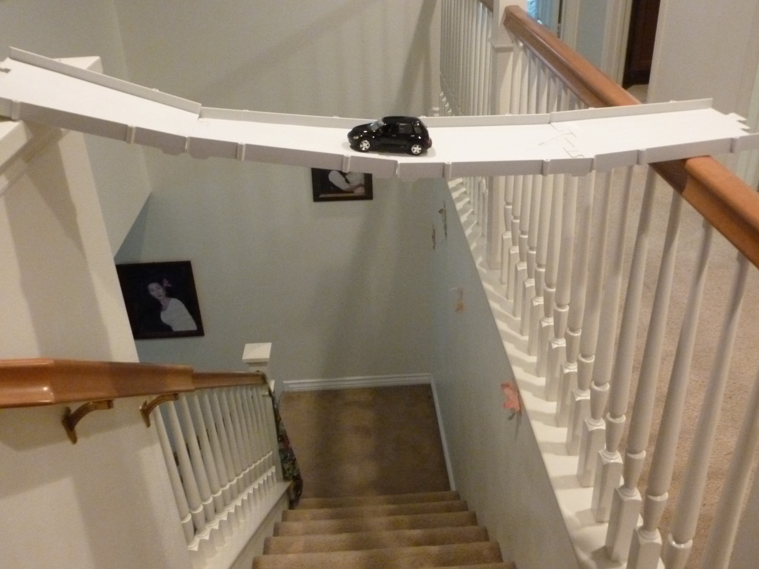 Some of my favorite constructions of his redeemed, last December, car tracks he had inherited without the remote-run cars. One, “a suspension bridge,” he declared. The other, a chocolate factory. He said he had a surprise for me, not to look ‘til he said ok. Unveiling his enterprise, Tennyson recited the beginning of Curious George and the Chocolate Factory: “This is George. He is always very curious…..” This particular episode runs like the famous I Love Lucy where L frantically shoves the pieces into her mouth as they shoot out from the conveyor tunnel on steroid speed. Tennyson was going to add blackstrap molasses to the chocolate. I’ll have to post his response when he takes his first bite of chocolate someday.