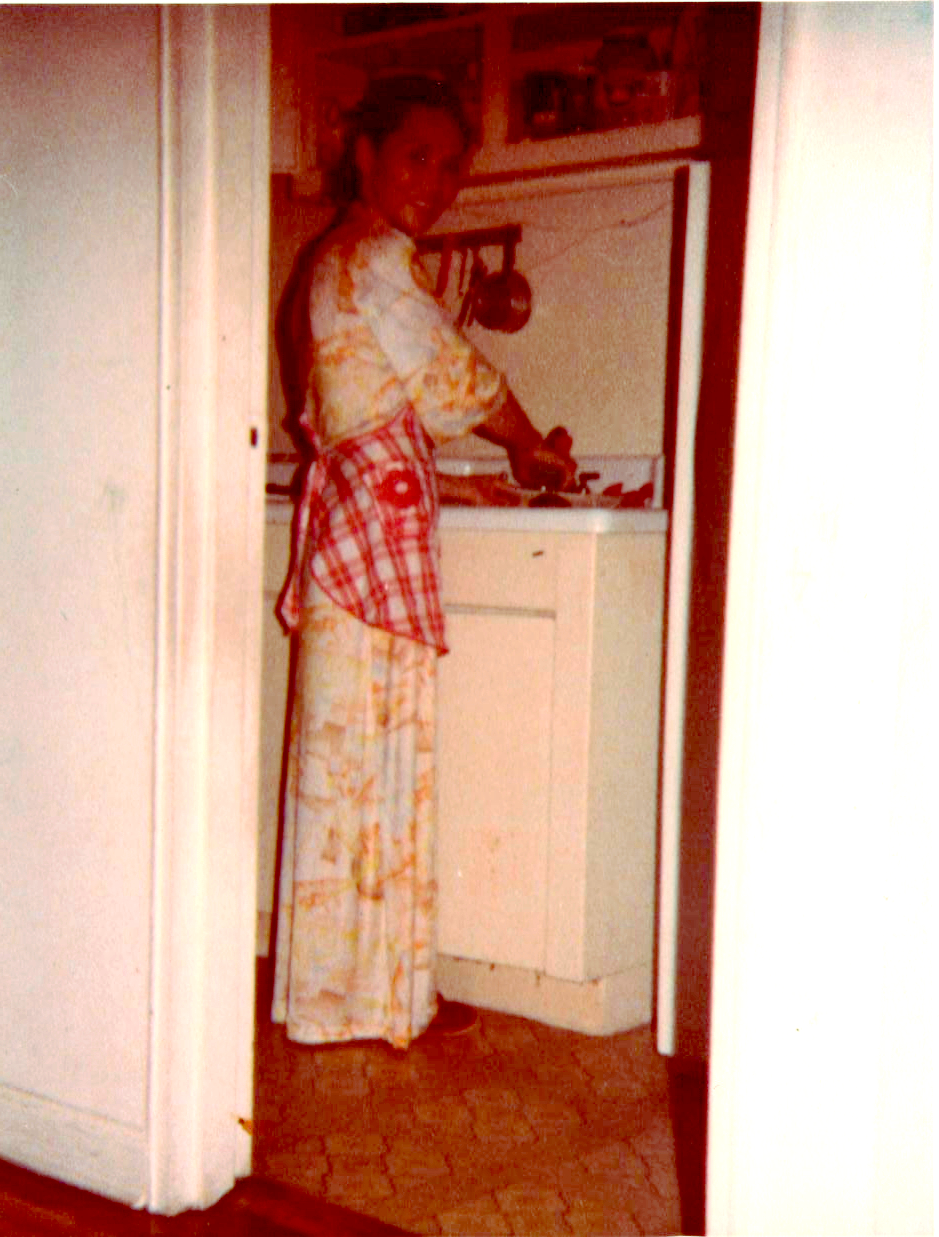 MomKitchenHow dare I draw myself up to Umma’s small frame in these comfortable shoes that cost more than what she ever spent on her own tired feet? It wasn’t just the waitressing that her legs ached from. She stood hours in the kitchen over the side dishes every traditional meal required. I don’t cook Korean. It’s misogynistic. Digging up this picture of Mom, I was surprised at the poor quality of the photo. It had stuck in my mind as a beautiful shot, one of my favorite of hers, but it was her radiance that had lodged itself in my memory even as she slaved away in a hole of an apartment with no ventilation.