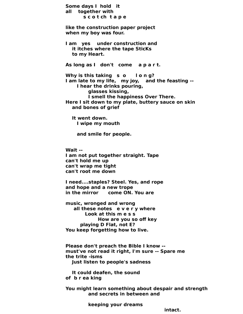 I love the structure of this poem. The placement of the words and the spacing between the letters–the disjointedness–highlights your opening line of holding it all together with Scotch tape. The pulling and unraveling we experience with that tape is a metaphor for life! What this brings to mind for me is how we all are looking for that one thing that will help hold us together, and make everything alright. Sometimes the search does make us “forget how to live” because we ignore our experiences along the way. We then realize that maybe not feeling like we have it all together is a fact of life and not something we need to escape from. Sometimes imperfection is freedom.