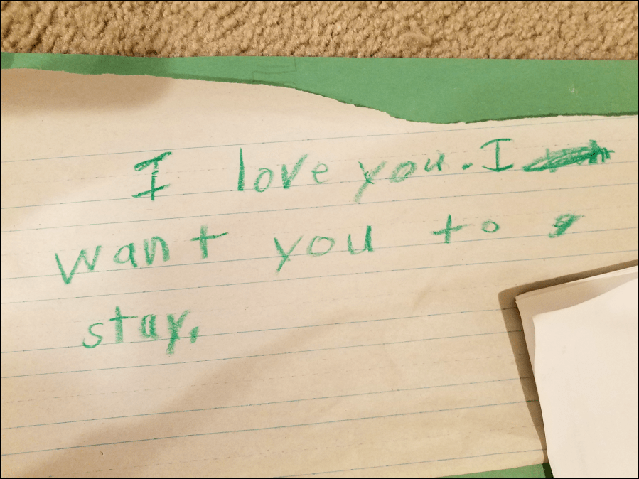 The note: it’s the handwriting of the child and of his living heart that breaks you. After all that, for the little one to step out of the young man and say: actually, I love you.